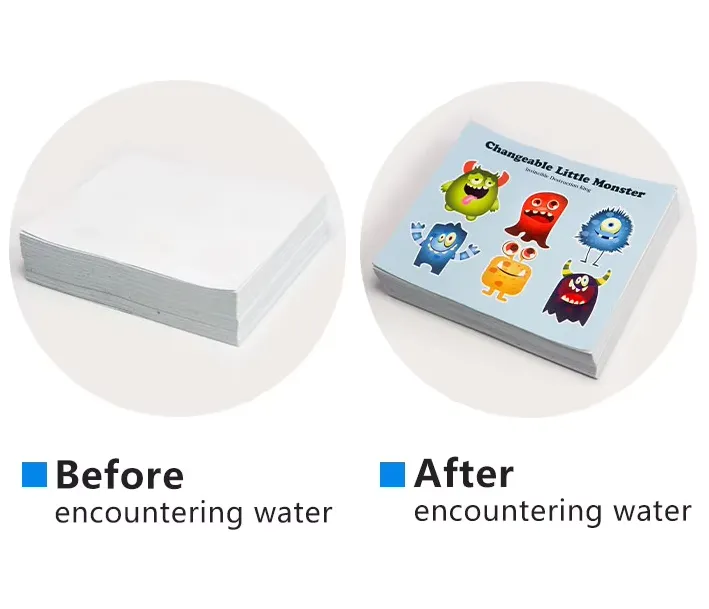 水に浸すとすぐにペースト状になり、素早く分散します。印刷された色はそれに応じて広がり、変形します。色の変化のプロセスは元に戻すことができません。一度水にさらすと、色が永久に表示されます。