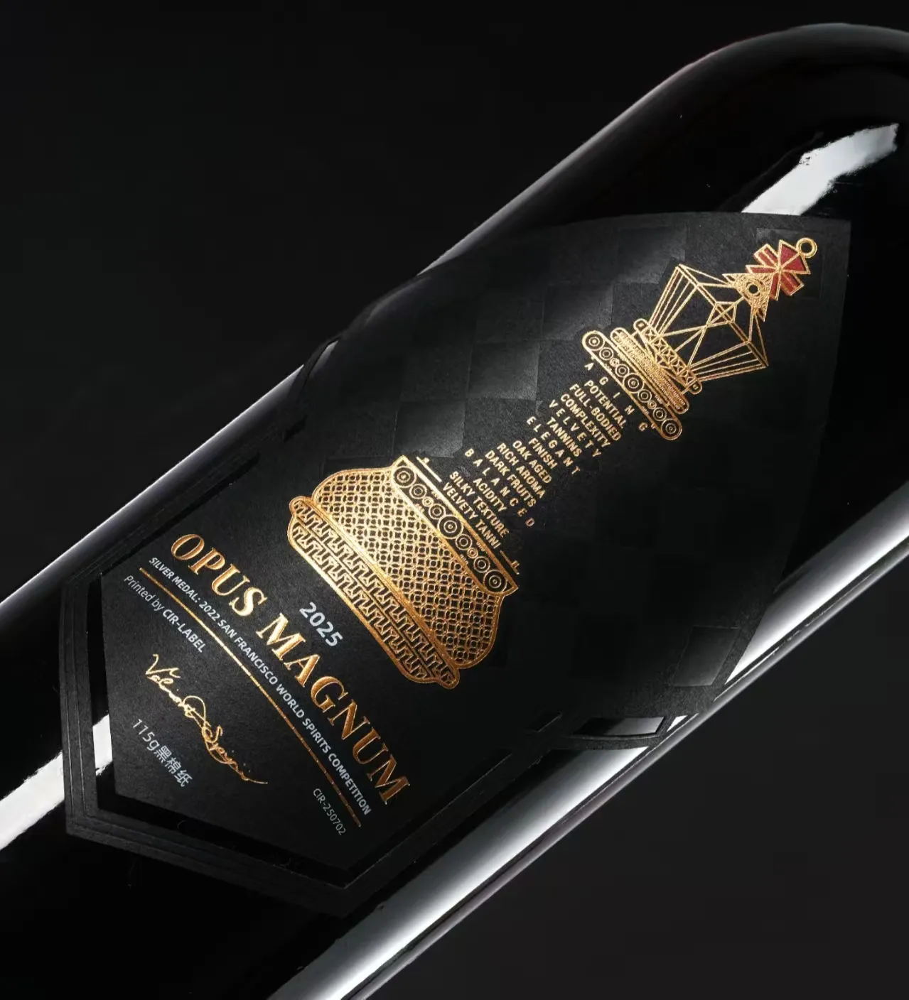 これワインのラベル微妙な雲のテクスチャ効果が特徴です。ステッカーのデザインには金の箔押しを採用し、ラベル全体に精緻な仕上がりとなっています。