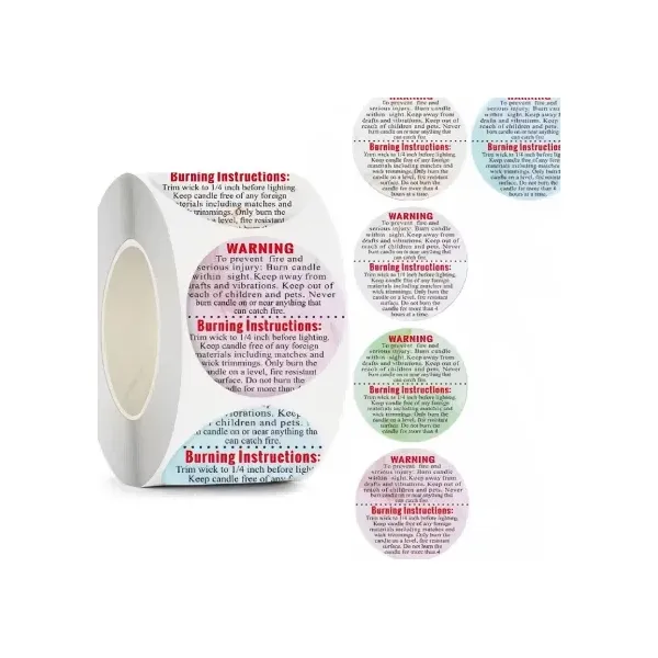 1. Product warning labels: Attached to the outer packaging or body of various products, informing consumers of safety precautions during the product's usage, such as "Do not disassemble" labels for electronic products, age limit labels for children's toys, and "Do not leave unattended for a long time" and "Turn off after use" labels for scented candles.